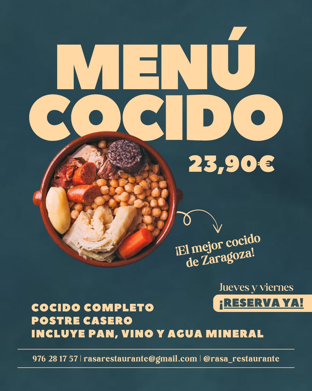 Rasa es uno de los lugares más recomendados para disfrutar de "EL MEJOR COCIDO DE ZARAGOZA" los jueves y los viernes.