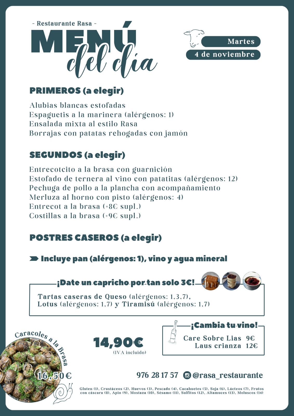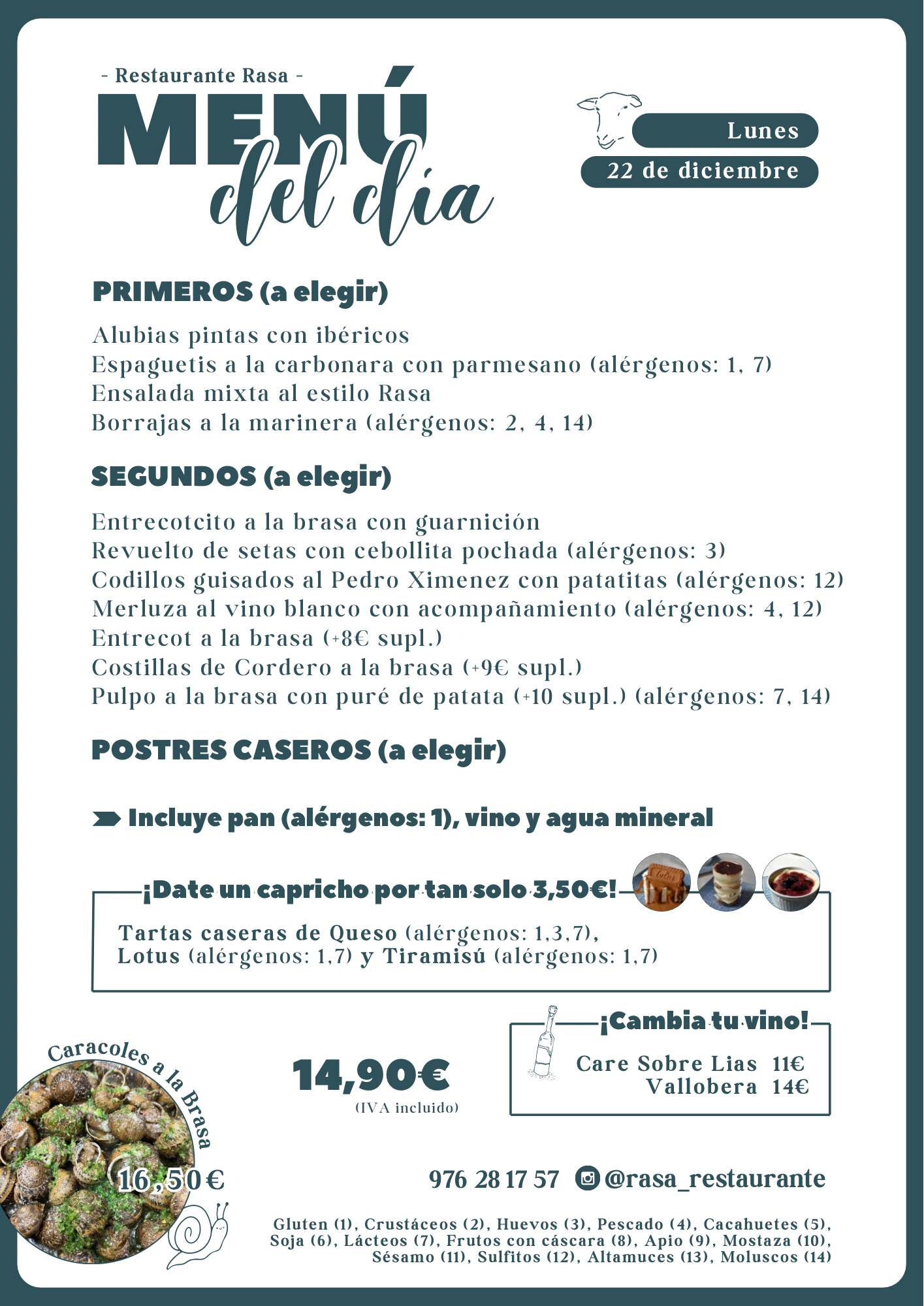 MENÚ DEL DÍA variado y para todos los gustos, ALMUERZOS, carta para CENAS viernes y sábados.
